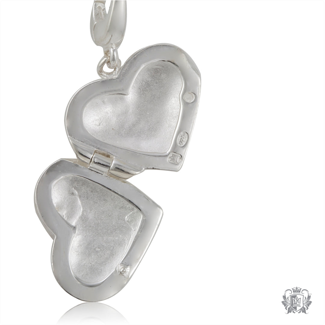 The puffy heart hinged locket measures about 18mm in total width, 14mm in height and 10mm in total thickness while closed. Insert a slender object or fingernail in to the sleek divot to pop it open, and click it securely shut once your tiny treasure has been stored.