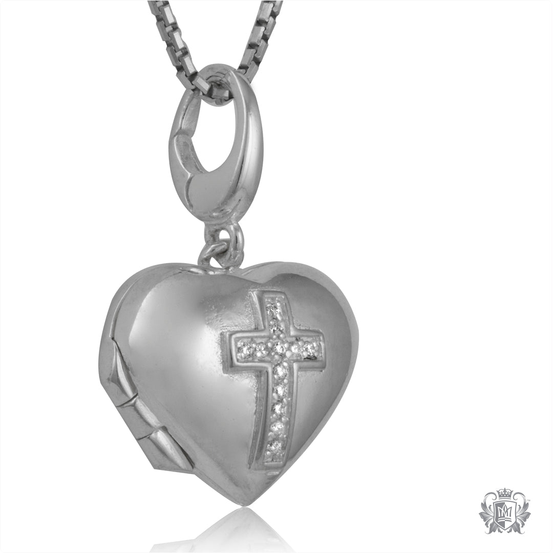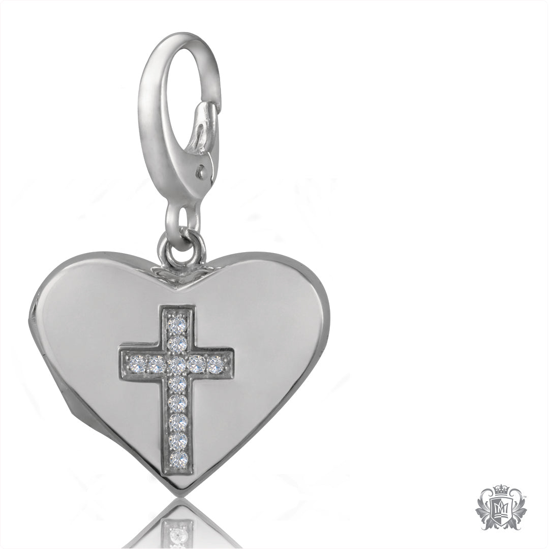 Show your devotion with this locket style charm that features a cross in high intensity cubics: this gorgeous charm opens like a locket so that you may keep a tiny memento close at hand.