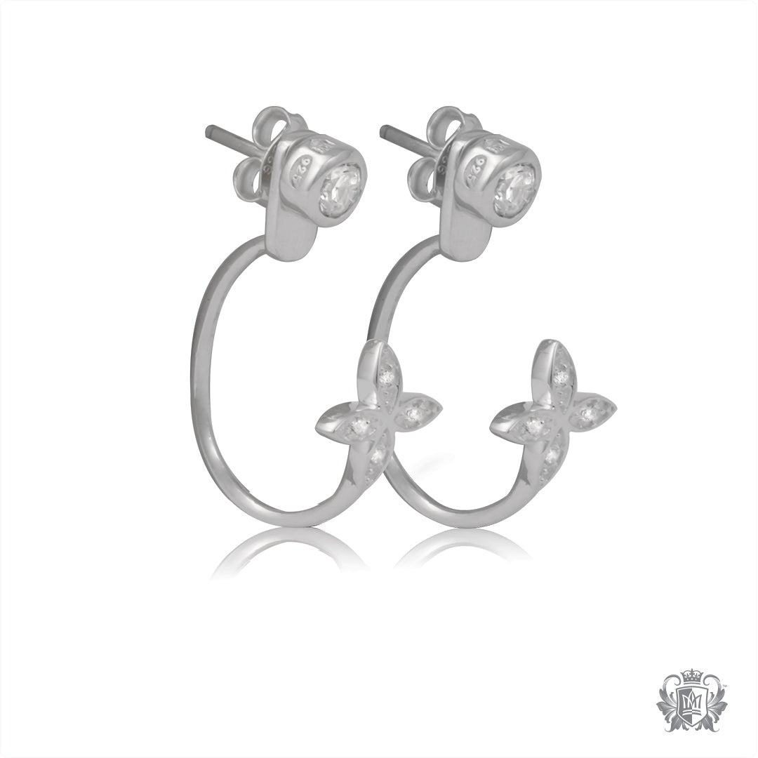 Trendy two in one reverse hoop earrings with bezel set high intensity cubic studs and elongated hoop with sparkling daisy accent.