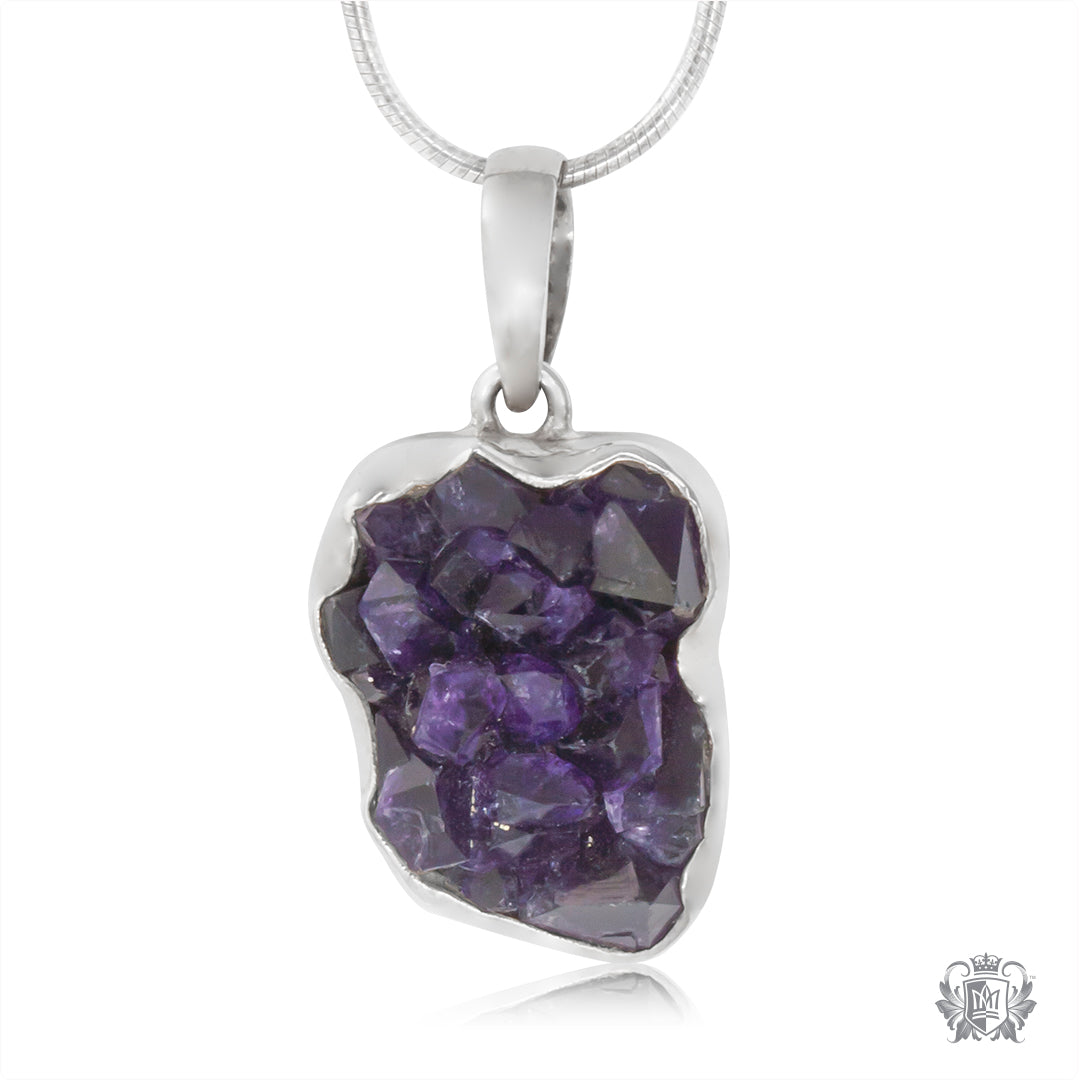 This rough cut amethyst pendant, exclusively from Metalsmiths Sterling features dazzling druzy crystals in deep violet shades.