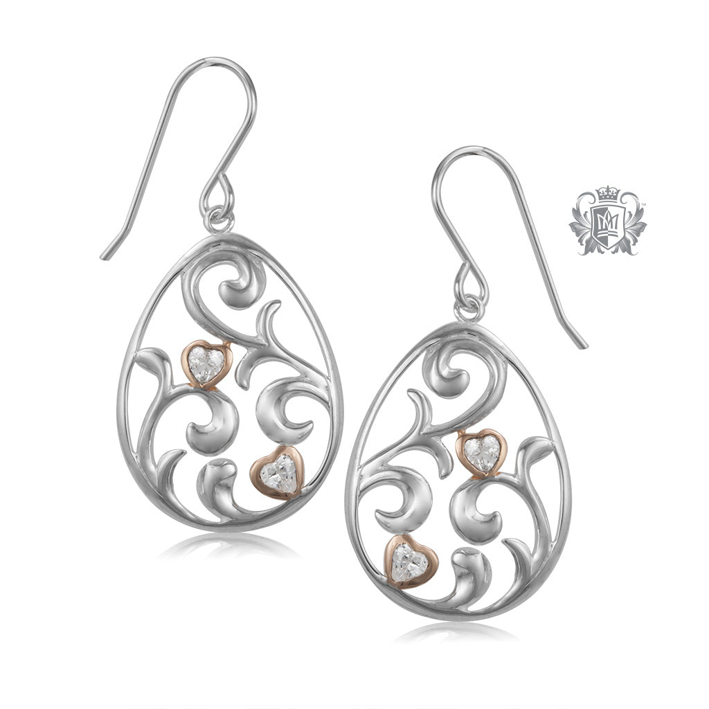 Sweet sparkling high intensity cubic hearts dazzle in a rose gold dipped sterling silver setting, growing from a scrolled and leafy motif in these modern teardrop shaped earrings, exclusive to Metalsmiths Sterling.