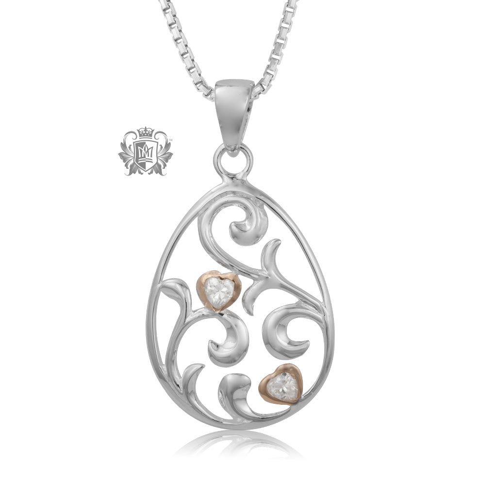 Sweet sparkling high intensity cubic hearts dazzle in a rose gold dipped sterling silver setting, growing from a scrolled and leafy motif in this modern teardrop shaped pendant, exclusive to Metalsmiths Sterling.