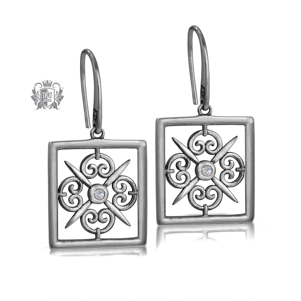 These divine dangly earrings from the Panos Konidas Collection, exclusive to Metalsmiths Sterling feature an openwork, squared design inspired by elements of old world architecture and a bezel set gem accent.