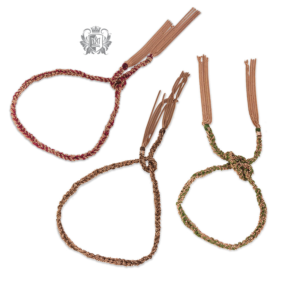Hand woven Italian silk and rose gold dipped sterling silver Knotted Bracelet from Metalsmiths Sterling. The bracelet comes in olive green, brown, and bordeaux.