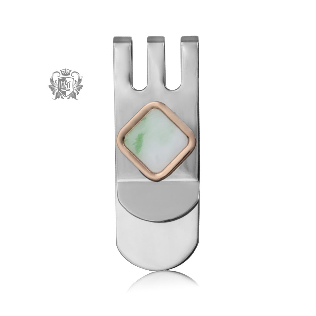 The modern shape of the money clip is accented with a jade inlay surrounded by a rose gold dipped accent.
