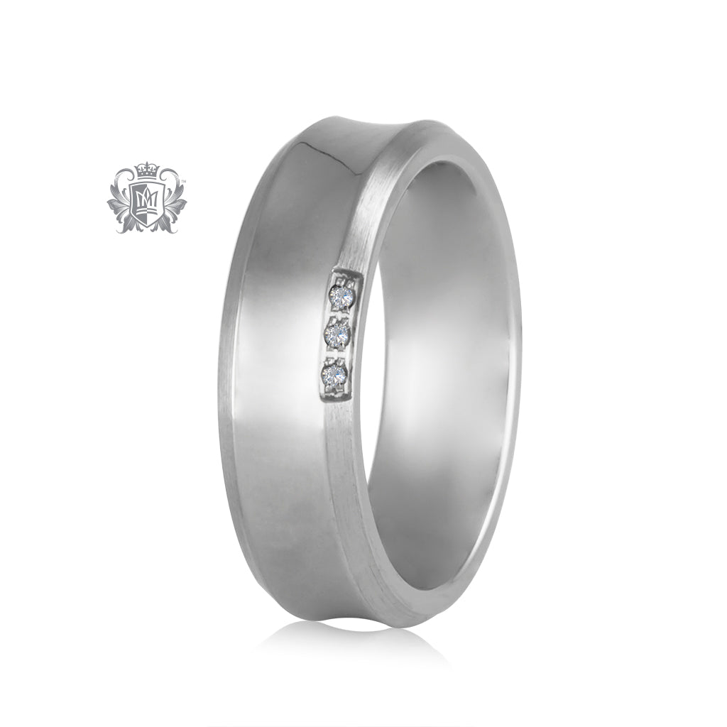 This gorgeous concave piece features 0.015 ct of sparkling diamonds. The band measures 8mm wide.