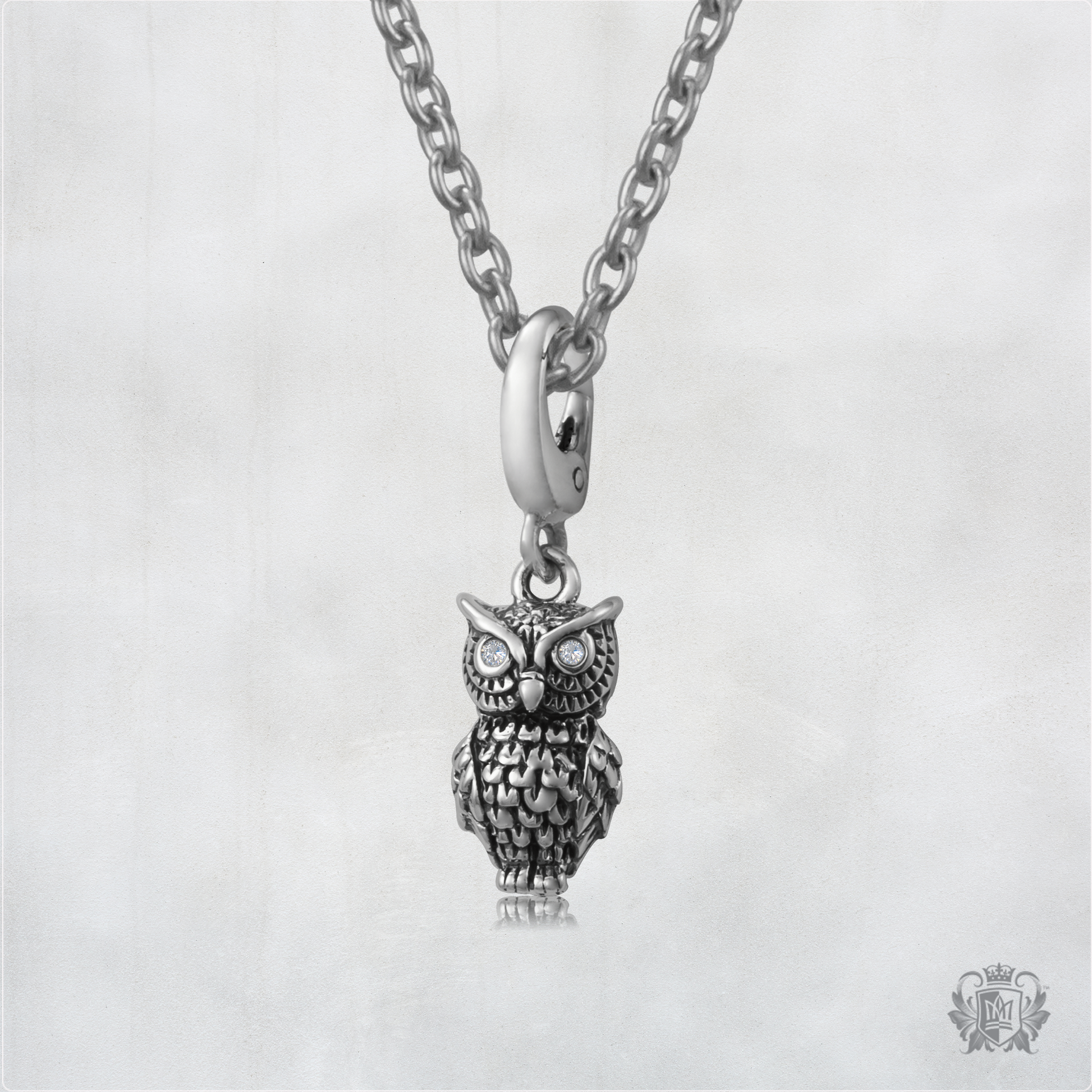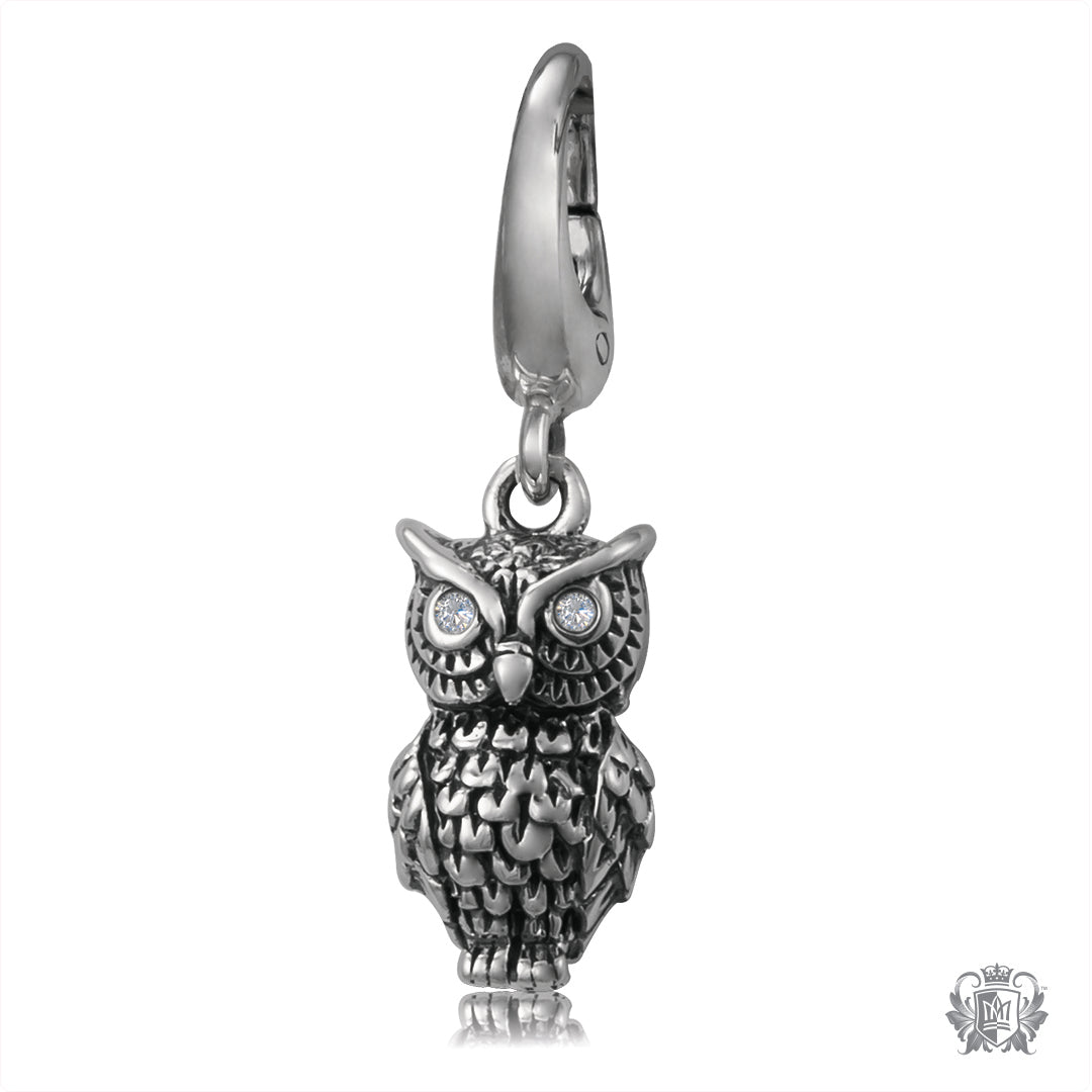 This perfectly detailed three dimensional owl charm g=features dazzling high intensity cubic eyes and measures about 12mm in total height, 7mm wide and 5mm thick. While hanging, the charm (including clipbail) measures about 25mm in total length.